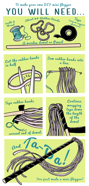 If you like, you can wrap duct tape around the entire “handle” of your flogger to make it easier to grip. And remember, to keep things safe, you only hit a partner with the flappy, rubber ends. Do not hit or prod them with the solid handle, as that can be painful in a way you don’t want.